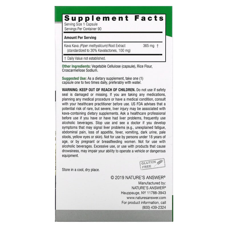 Nature’s Answer Standardized Kava-6 là một sản phẩm bổ sung chế độ ăn uống được chiết xuất từ rễ cây Kava (Piper methysticum), nổi tiếng với khả năng hỗ trợ giảm căng thẳng và cải thiện trạng thái tâm lý. Sản phẩm này được sản xuất bởi hãng Nature’s Answer, một thương hiệu uy tín chuyên cung cấp các sản phẩm thảo dược chất lượng cao từ năm 1972. Với công nghệ Advanced Botanical Fingerprint Technology, Nature’s Answer đảm bảo rằng mỗi sản phẩm đều chứa những thành phần tự nhiên tinh khiết và hiệu quả nhất.