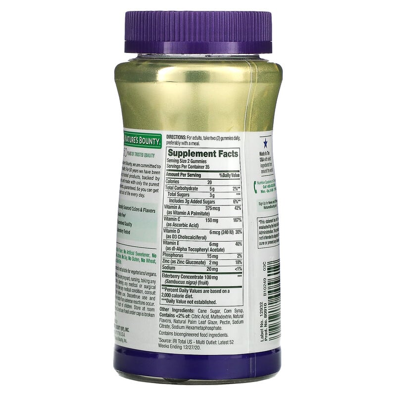 Kẹo dẻo Nature's Bounty Elderberry 50mg hỗ trợ miễn dịch, tăng cường sức khỏe với 70 viên từ hãng Nature's Bounty, an toàn và dễ sử dụng. 074312005619