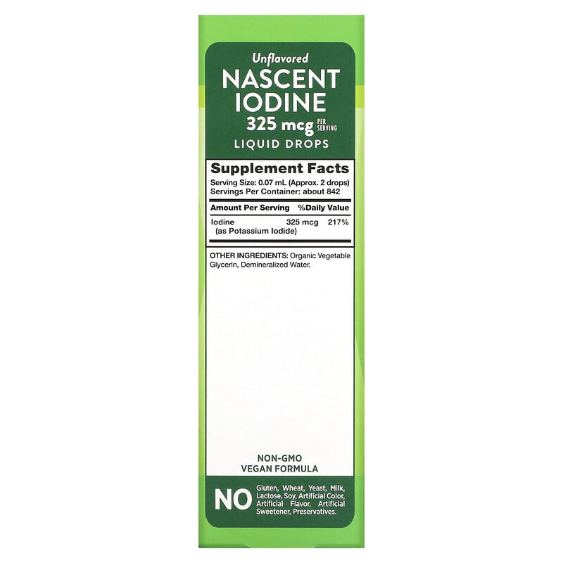 Nature’s Truth Vitamins Nascent Iodine Liquid Drops được chiết xuất từ iodine dạng potassium iodide, một dạng iodine dễ hấp thụ và hiệu quả. Ngoài ra, sản phẩm còn chứa các thành phần khác như glycerin thực vật hữu cơ và nước khử khoáng, đảm bảo an toàn cho người sử dụng. Sản phẩm hoàn toàn không chứa gluten, lúa mì, đậu nành, lactose hay các phẩm màu và hương liệu nhân tạo, rất phù hợp cho những ai có chế độ ăn kiêng nghiêm ngặt.