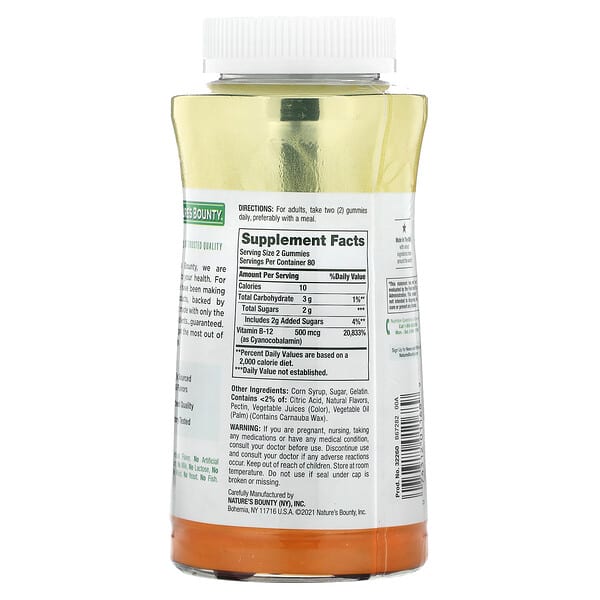 Mỗi viên nhai Nature’s Bounty B-12 cung cấp 1000 mcg vitamin B12 (dưới dạng methylcobalamin), cùng với các hương liệu tự nhiên như mâm xôi, trái cây hỗn hợp và cam, mang lại hương vị dễ chịu cho người sử dụng. Sản phẩm không chứa đường, không chứa gluten và không có thành phần nhân tạo.