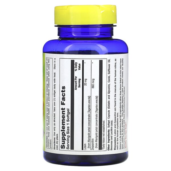 Nature’s Life, Lutein được chiết xuất từ hoa cúc vạn thọ (Tagetes Erecta), cung cấp cho cơ thể lượng Lutein và Zeaxanthin cần thiết. Cụ thể, mỗi viên nang mềm chứa: