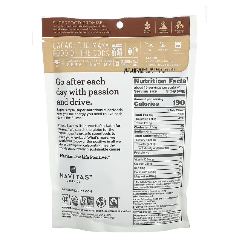 Cacao Nibs hữu cơ Navitas Organics 454g, giàu dinh dưỡng, hương vị thơm ngon, hỗ trợ sức khỏe, nguyên liệu tự nhiên cho món ăn và đồ uống. 858847000697