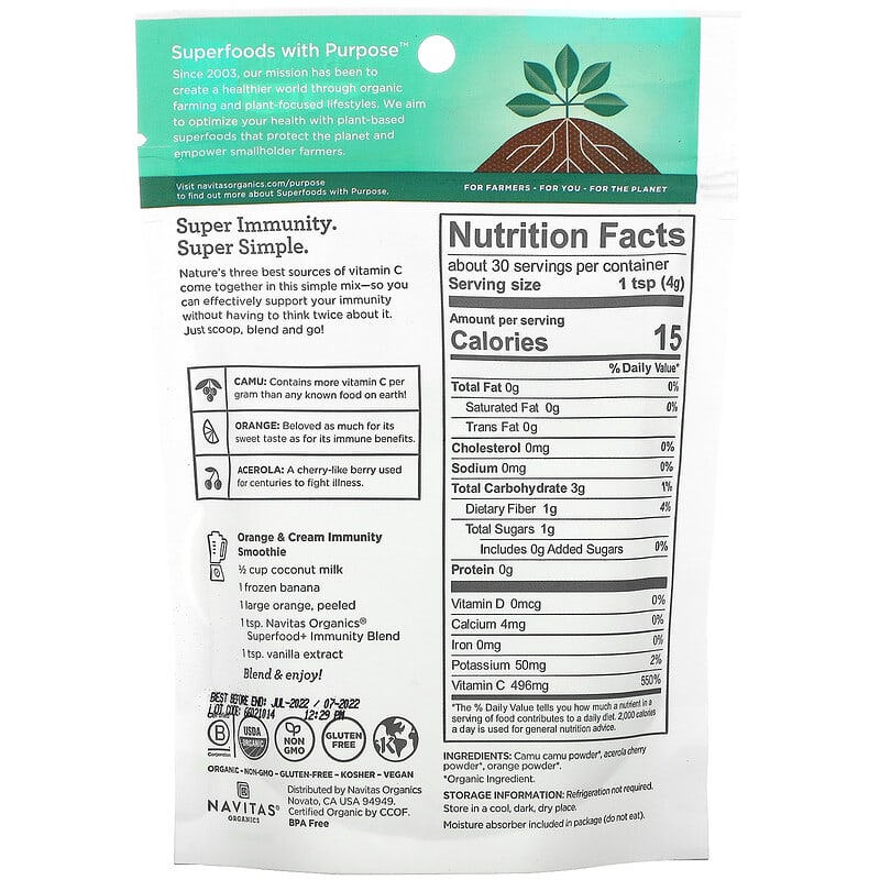 Giới thiệu sản phẩm: Navitas Organics Organic Superfood+ Immunity Blend Vitamin C Powerhouse Camu + Orange + Acerola Cherry 4.2 oz (120 g)