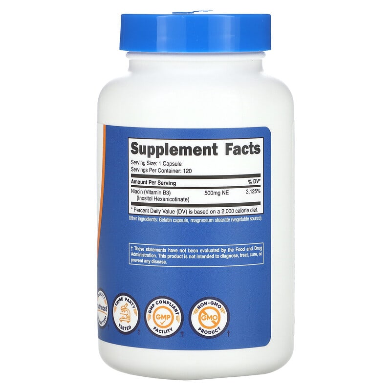 Nutricost Niacin Flush-Free được chiết xuất từ Inositol Hexanicotinate, một dạng của niacin (vitamin B3) không gây hiện tượng nóng bừng (flush) cho cơ thể. Mỗi viên nang chứa 500 mg niacin, với tổng cộng 120 viên trong một hộp.