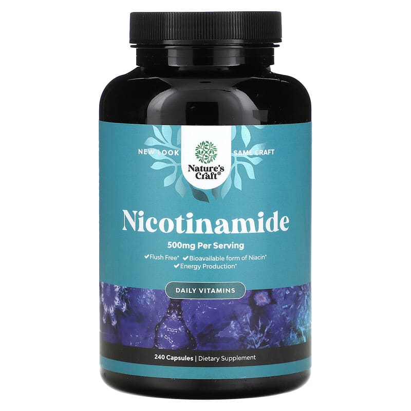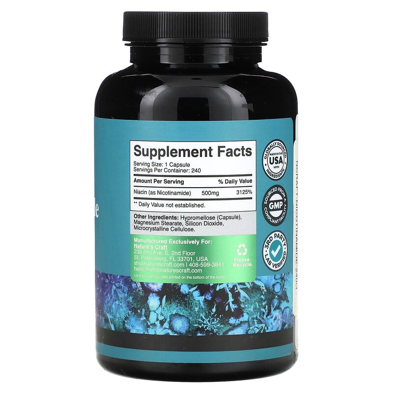 Nicotinamide Nature's Craft 500 mg hỗ trợ sức khỏe, tăng cường năng lượng và bảo vệ tế bào, 240 viên vitamin hàng ngày., UPC 850047947413