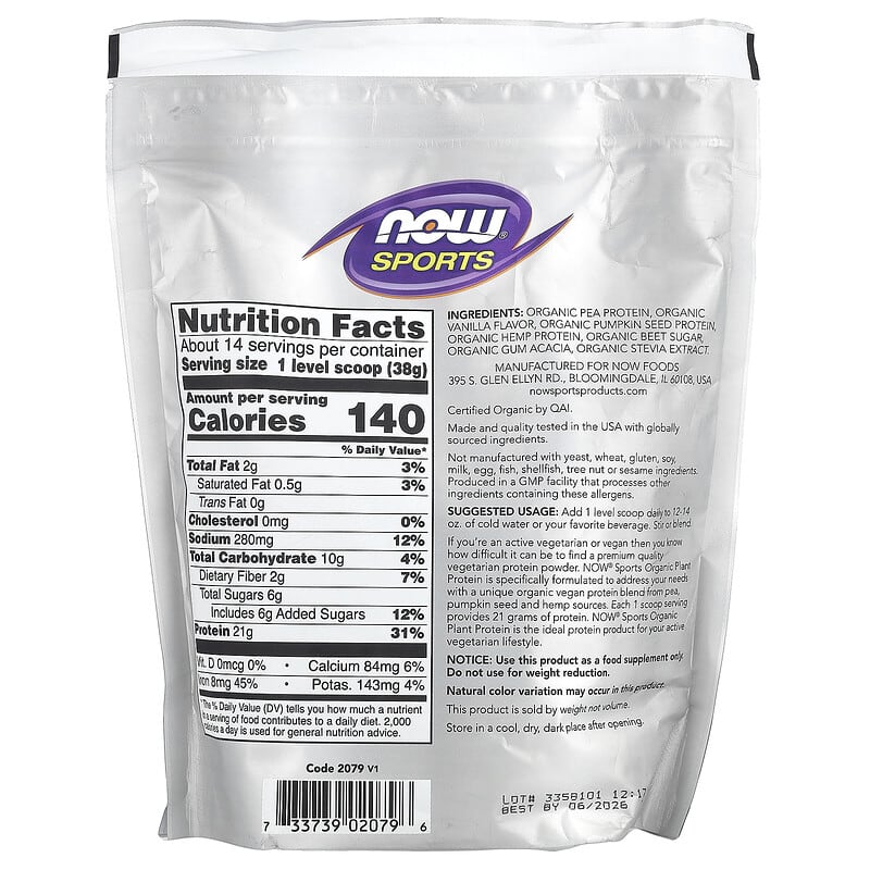 Giới thiệu sản phẩm NOW Foods Sports Organic Plant Protein Powder Creamy Vanilla 1,2 lbs (544 g)