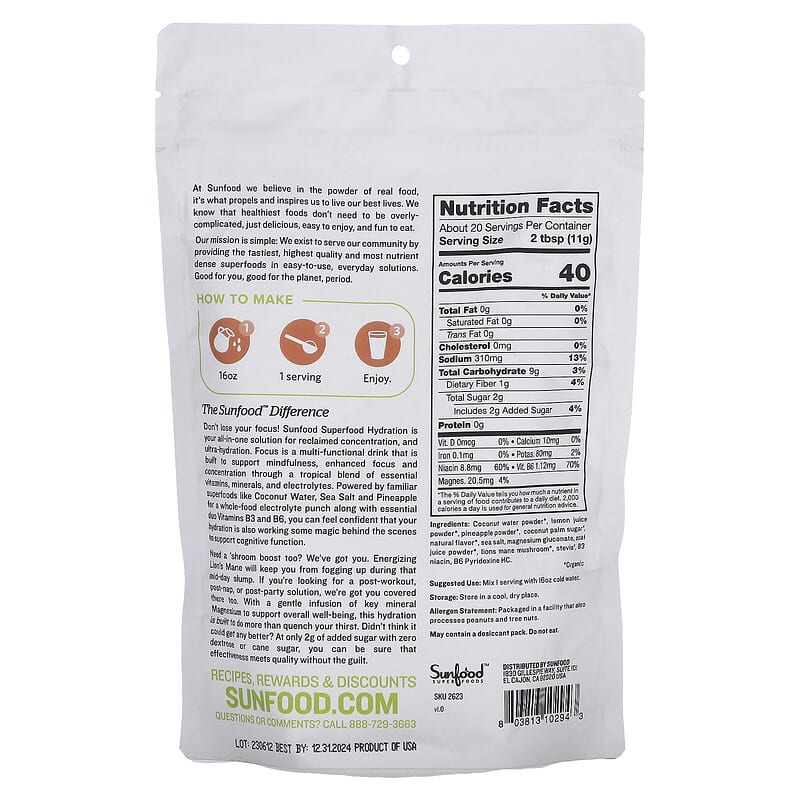 Sunfood Superfood Hydration Focus được chế biến từ những thành phần tự nhiên, bao gồm: