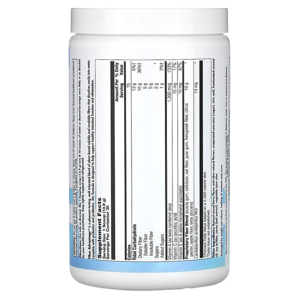 Nutra BioGenesis Fiber Advantage chứa một hỗn hợp độc quyền của các loại chất xơ hòa tan và không hòa tan từ thực vật. Mỗi muỗng (13,9 g) cung cấp: