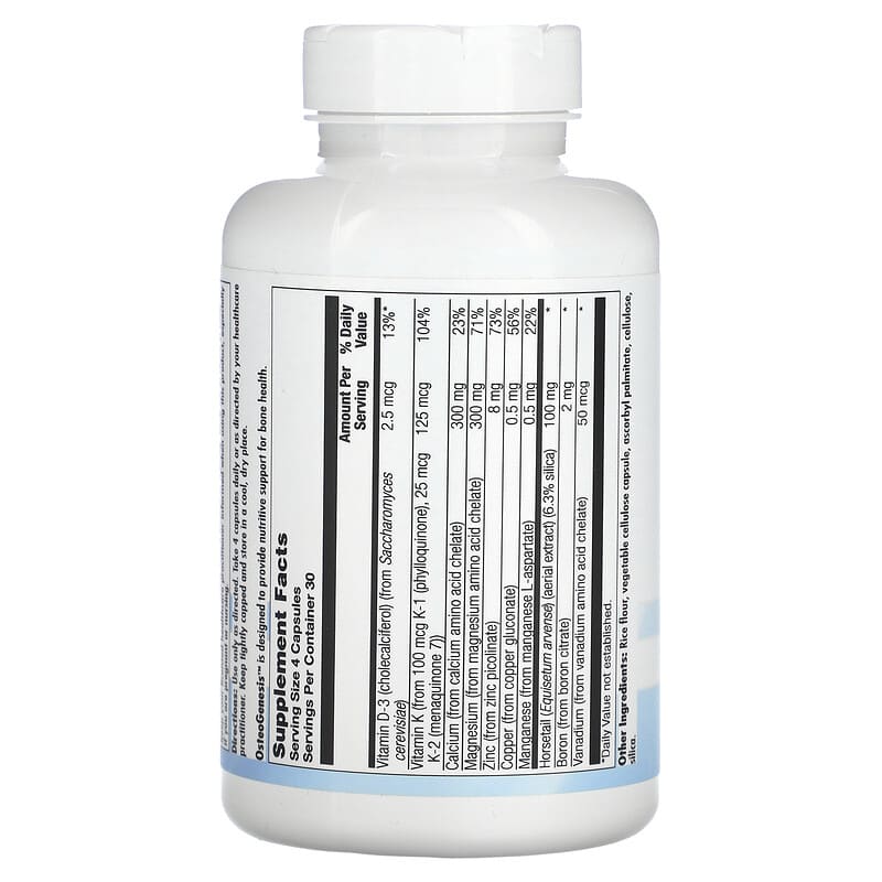 Nutra BioGenesis OsteoGenesis được bào chế từ những thành phần tự nhiên, không chứa GMO và hoàn toàn thuần chay, phù hợp cho những ai đang tìm kiếm giải pháp bổ sung dinh dưỡng an toàn. Mỗi khẩu phần 4 viên chứa: