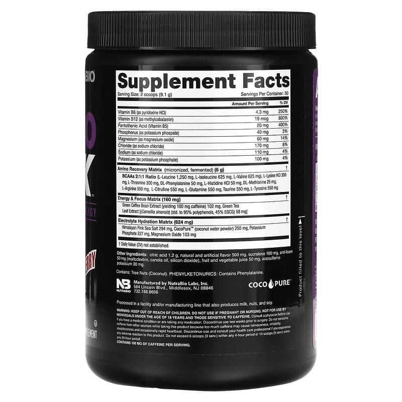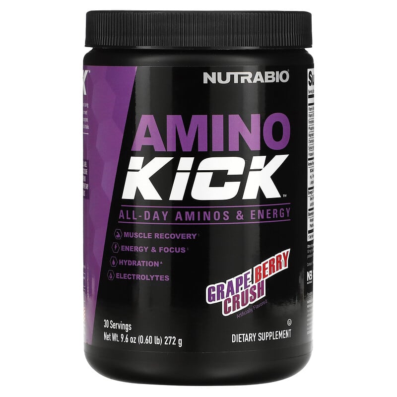 Nutrabio Labs Amino Kick Grape Berry Crush 0.6 lb bổ sung năng lượng, tăng cường phục hồi cơ bắp, hương vị nho berry thơm ngon, lý tưởng cho tập luyện 649908217501