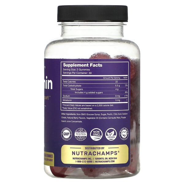 NutraChamps Melatonin Natural Berry bao gồm các thành phần tự nhiên và an toàn cho sức khỏe. Mỗi viên nhai chứa: