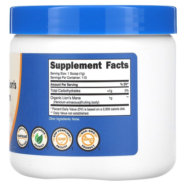 Thông tin sản phẩm Nutricost, 100% Organic Lion’s Mane Mushroom, không mùi vị, 4 oz (113 g)