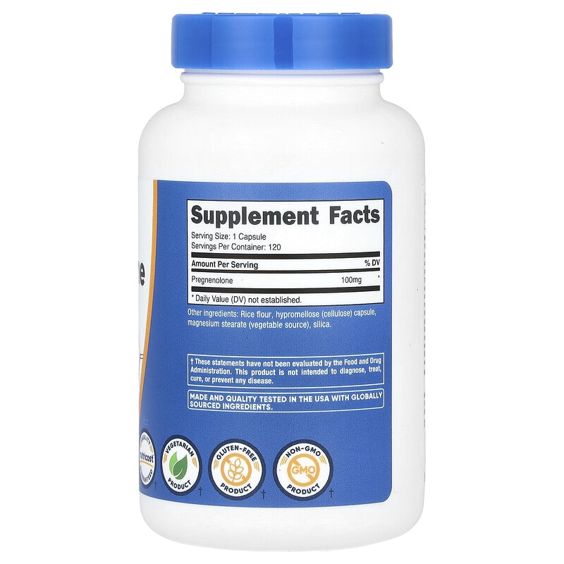 Nutricost Pregnenolone 100 mg hỗ trợ sức khỏe tổng thể, tăng cường năng lượng và cải thiện tâm trạng. 120 viên dễ sử dụng., UPC 810014673493