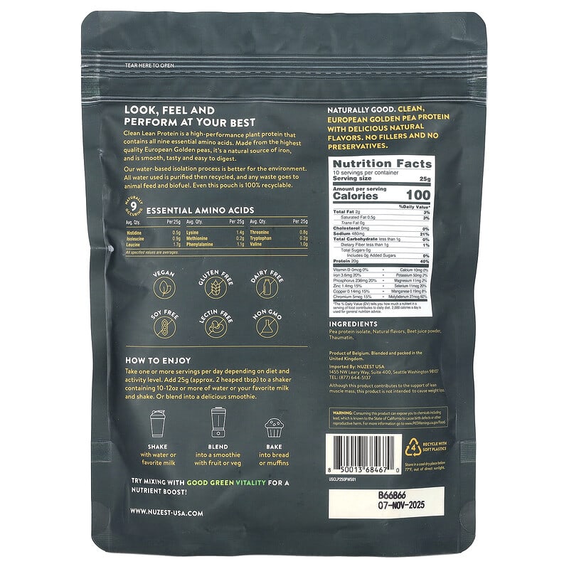 Nuzest Clean Lean Protein Wild Strawberry được chiết xuất từ đậu xanh châu Âu, một nguồn protein thực vật tuyệt vời. Mỗi khẩu phần 25 g cung cấp tới 20 g protein, cùng với một lượng nhỏ carbohydrate và hoàn toàn không có đường. Sản phẩm này cũng chứa các vitamin và khoáng chất thiết yếu như sắt, phốt pho, kẽm, đồng, và canxi, giúp bổ sung dinh dưỡng cho cơ thể.