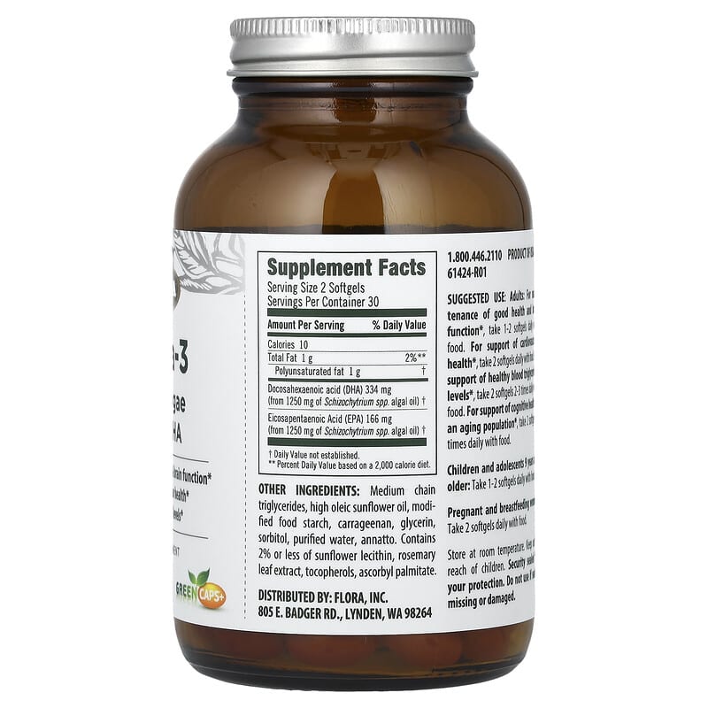 Viên uống Omega-3 EPA DHA từ tảo vegan Flora 60 viên mềm, hỗ trợ sức khỏe tim mạch và não bộ, an toàn cho người ăn chay., UPC 061998614242