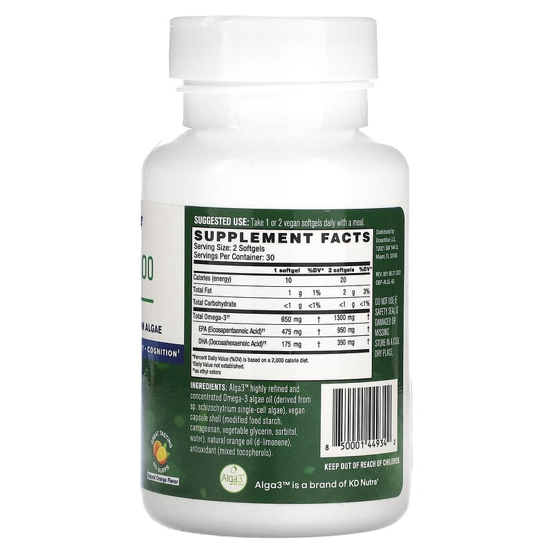 Omega-3 Vegan OceanBlue 1300mg, viên mềm tự nhiên vị cam, hỗ trợ sức khỏe tim mạch, 60 viên, công thức cao cấp., UPC 850001449342