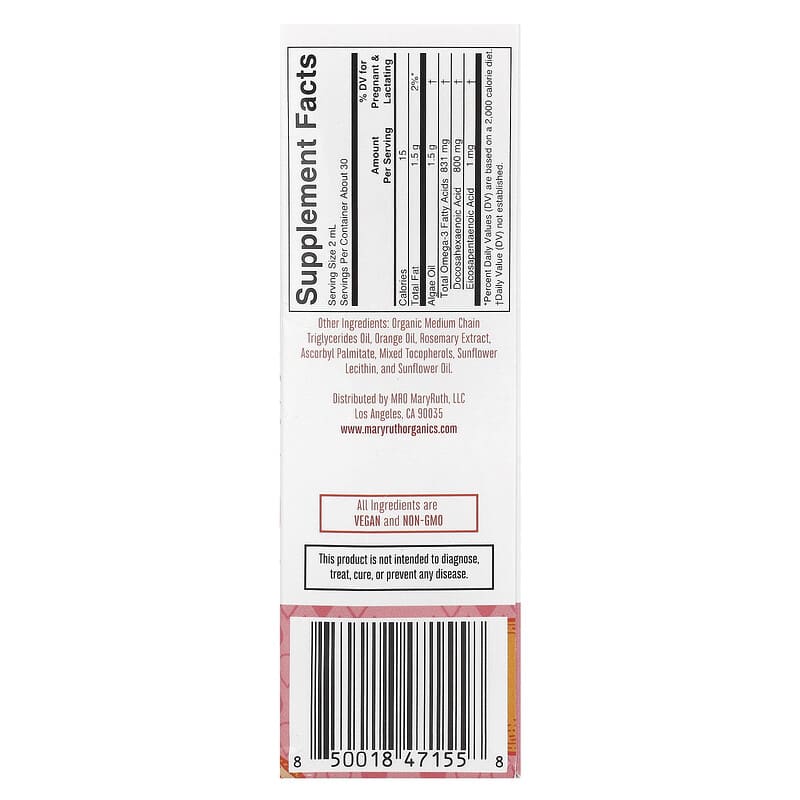 Giọt Omega-3 Prenatal & Postnatal MaryRuth's Hương Cam 60ml hỗ trợ sức khỏe mẹ và bé, cung cấp DHA và EPA cần thiết., UPC 850018471558