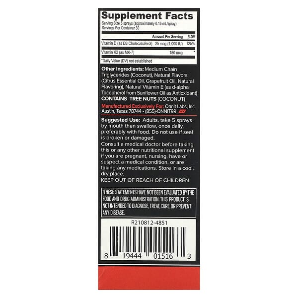 Thông tin sản phẩm Onnit, Plant Based Vitamin D3 with Vitamin K2, Grapefruit, 25 mcg (1.000 IU), 0,8 fl oz (24 ml)
