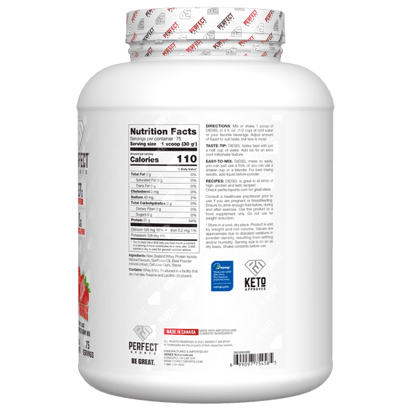 Bột protein PERFECT Sports Diesel New Zealand Whey Isolate vị dâu 5 lb, sản phẩm chính hãng nhập khẩu từ Mỹ, hỗ trợ tăng cường cơ bắp., UPC: 699097754585