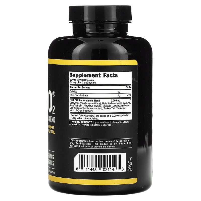 Peak 02® Performance Blend Cordyceps (Cordyceps militaris), Reishi (Ganoderma lucidum), King Trumpet (Pleurotus eryngii), Shiitake (Lentinula edodes), Lion’s Mane (Hericium erinaceus), Turkey Tail (Trametes versicolor) (as PeakO2®). | 2,000 mg | ** |