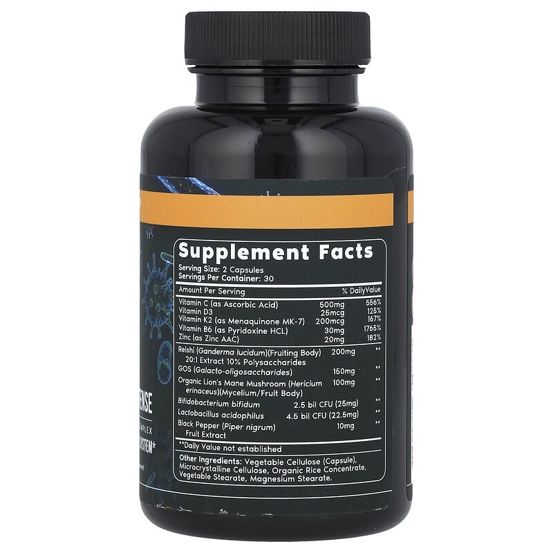 Vitamin C (as Ascorbic Acid) Vitamin D3 Vitamin K2 (as Menaquinone MK-7) Vitamin B6 (as Pyridoxine HCL) Zinc (as Zinc AAC) | 500 mg 25 mcg 200 mcg 30 mg 20 mg | 556% 125% 167% 1,765% 182% |