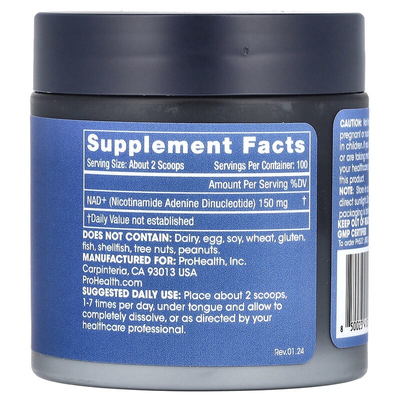 ProHealth Longevity NAD+ Pro 15 g chứa 15 gram bột NAD+ tinh khiết. NAD+ hay Nicotinamide Adenine Dinucleotide là một coenzyme quan trọng có mặt trong tất cả các tế bào sống. Bên cạnh NAD+, sản phẩm không chứa các thành phần gây dị ứng như: sữa, trứng, đậu nành, lúa mì, gluten, cá, động vật có vỏ, hạt cây và đậu phộng. Điều này giúp sản phẩm phù hợp với nhiều đối tượng khác nhau, đặc biệt là những người có chế độ ăn kiêng hoặc dị ứng thực phẩm.