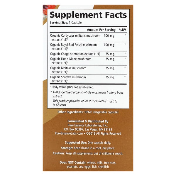 Tất cả các thành phần đều là chiết xuất từ trái cây nấm hữu cơ, đảm bảo độ tinh khiết và hiệu quả cao nhất. Sản phẩm cung cấp ít nhất 25% Beta-(1,3)(1,6)-D-Glucans, một hợp chất quan trọng giúp tăng cường hệ miễn dịch.