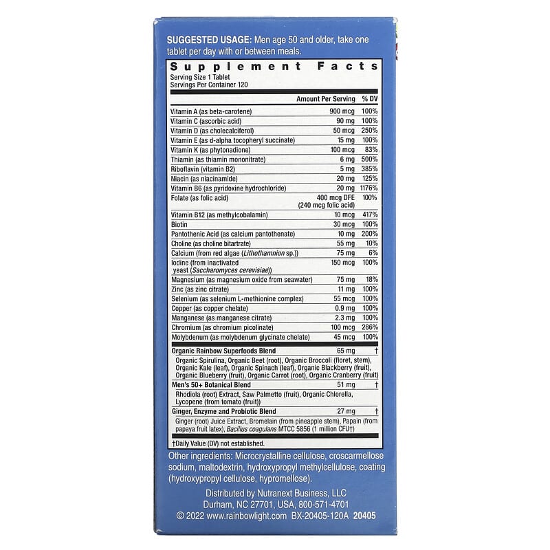 – Men’s 50+ Botanical Blend: Rhodiola, Saw Palmetto, Organic Chlorella, Lycopene.