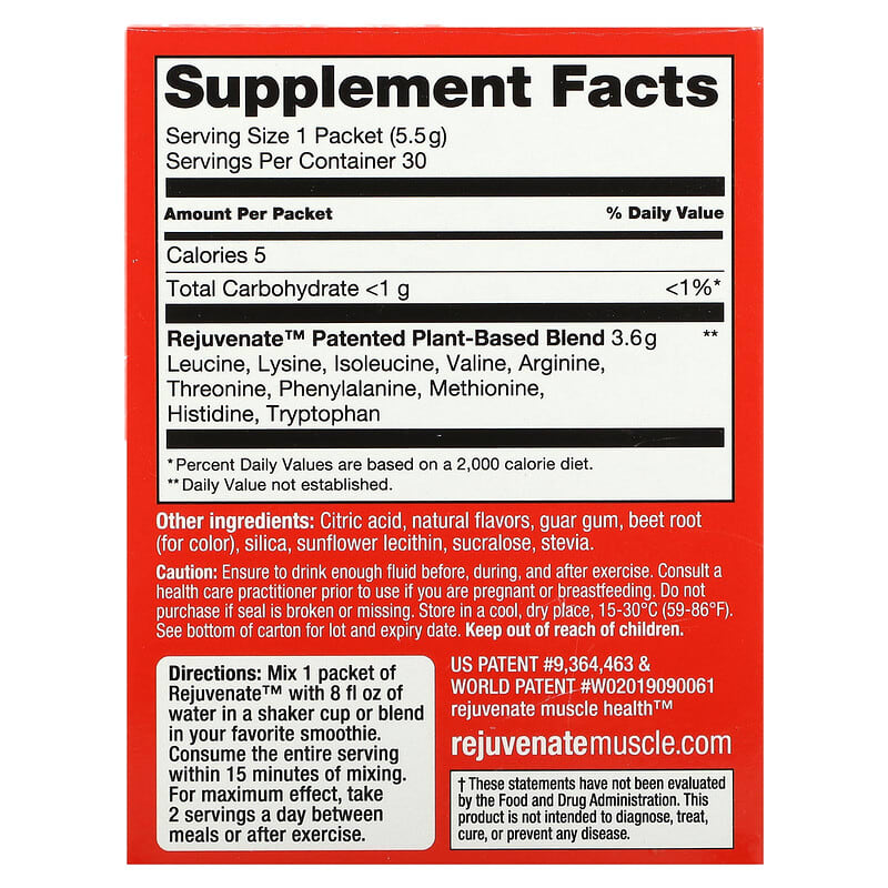 – Rejuvenate™ Patented Plant-Based Blend: Gồm các amino acid thiết yếu như Leucine, Lysine, Isoleucine, Valine, Arginine, Threonine, Phenylalanine, Methionine, Histidine, và Tryptophan, giúp cung cấp đầy đủ các dưỡng chất cần thiết cho cơ bắp.