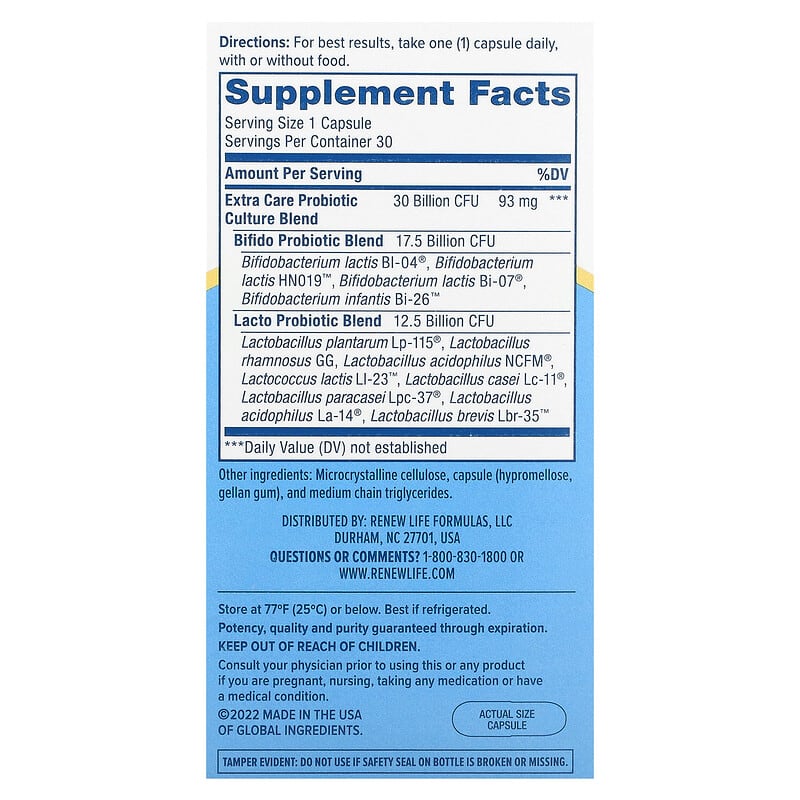 Renew Life Ultimate Flora Extra Care Probiotic chứa 30 tỷ CFU (Colony Forming Units) trong mỗi viên, với sự kết hợp của 12 chủng vi khuẩn có lợi. Các thành phần chính bao gồm: