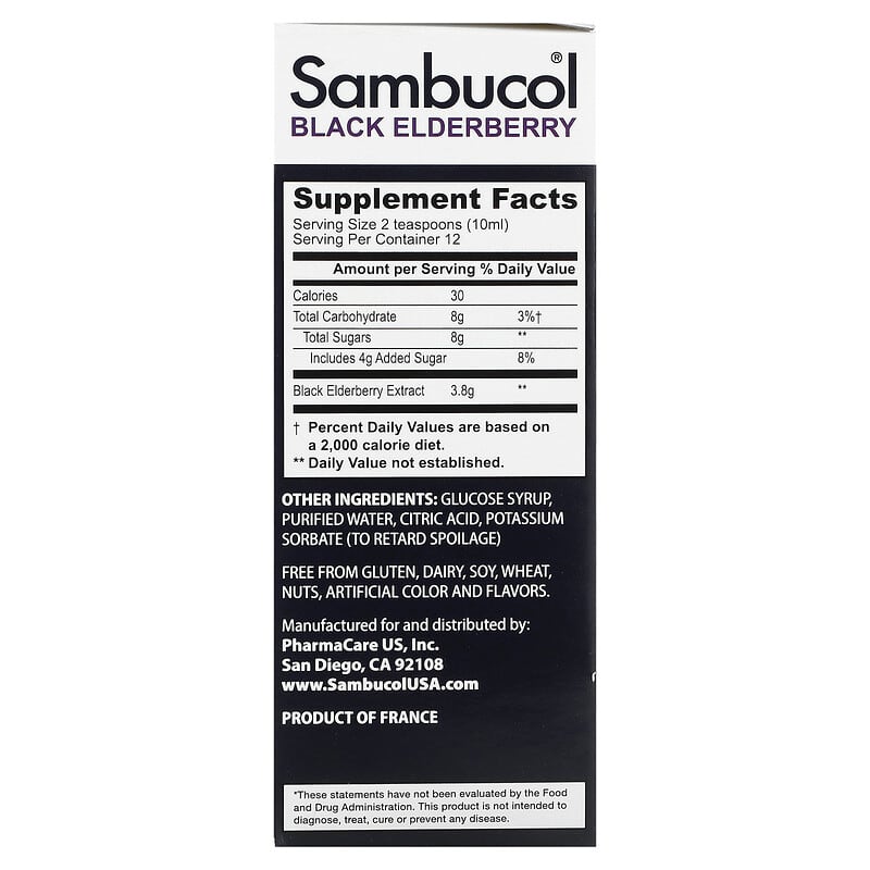 Sambucol Black Elderberry Syrup được chiết xuất từ quả cơm nguội đen, một nguồn giàu vitamin C và các chất chống oxy hóa. Các thành phần khác bao gồm: