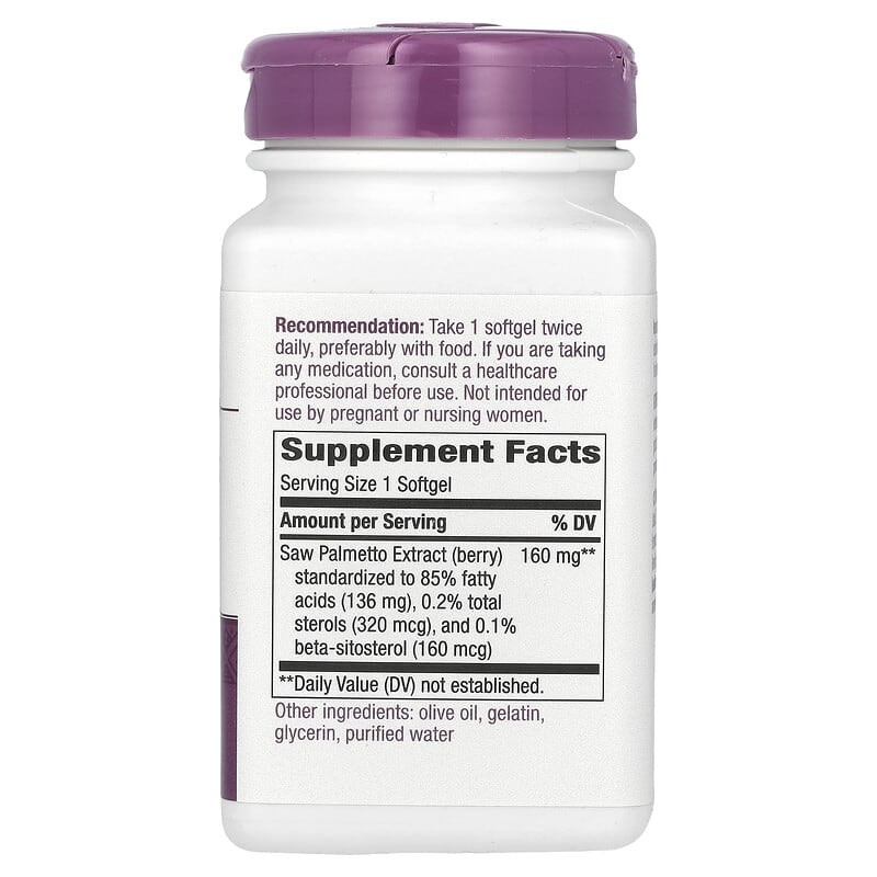 Nature’s Way Saw Palmetto được chiết xuất từ trái cây của cây cọ Saw Palmetto, loại cây chỉ mọc ở vùng đầm lầy Florida Everglades. Sản phẩm này cung cấp một liều lượng 160 mg chiết xuất Saw Palmetto trong mỗi viên nang mềm. Chiết xuất này được tiêu chuẩn hóa với 85% axit béo và chứa 0,2% sterol tổng cộng (320 mcg) cùng 0,1% beta-sitosterol (160 mcg).