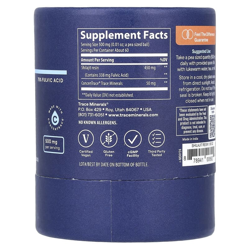 Trace Minerals ® Shilajit chứa 75% axit fulvic, một hợp chất tự nhiên được biết đến với khả năng hấp thụ tối đa dưỡng chất. Mỗi khẩu phần (500 mg) cung cấp 338 mg axit fulvic và 50 mg khoáng chất từ ConcenTrace, mang lại một loạt các khoáng chất vi lượng cần thiết cho cơ thể. Shilajit là một loại nhựa khoáng giàu dưỡng chất, hình thành từ sự phân hủy của các loại thực vật qua hàng thế kỷ, thường xuất hiện trên các tảng đá ở dãy Himalaya.