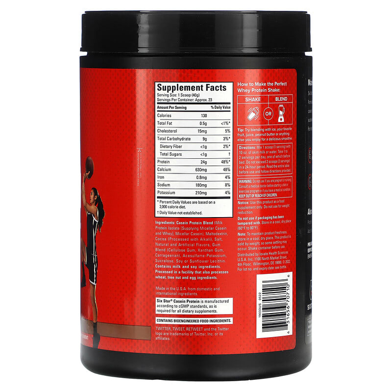 Six Star Elite Series Casein Protein được thiết kế để cung cấp 24 g protein trong mỗi khẩu phần, giúp duy trì sự phát triển cơ bắp và tăng cường sức mạnh. Thành phần casein trong sản phẩm này có khả năng giải phóng amino acid từ từ trong vòng 8 giờ, giúp nuôi dưỡng cơ bắp liên tục, đặc biệt là trong thời gian ngủ. Điều này rất quan trọng đối với những người tập luyện cường độ cao, những người cần phục hồi cơ bắp sau khi tập luyện.