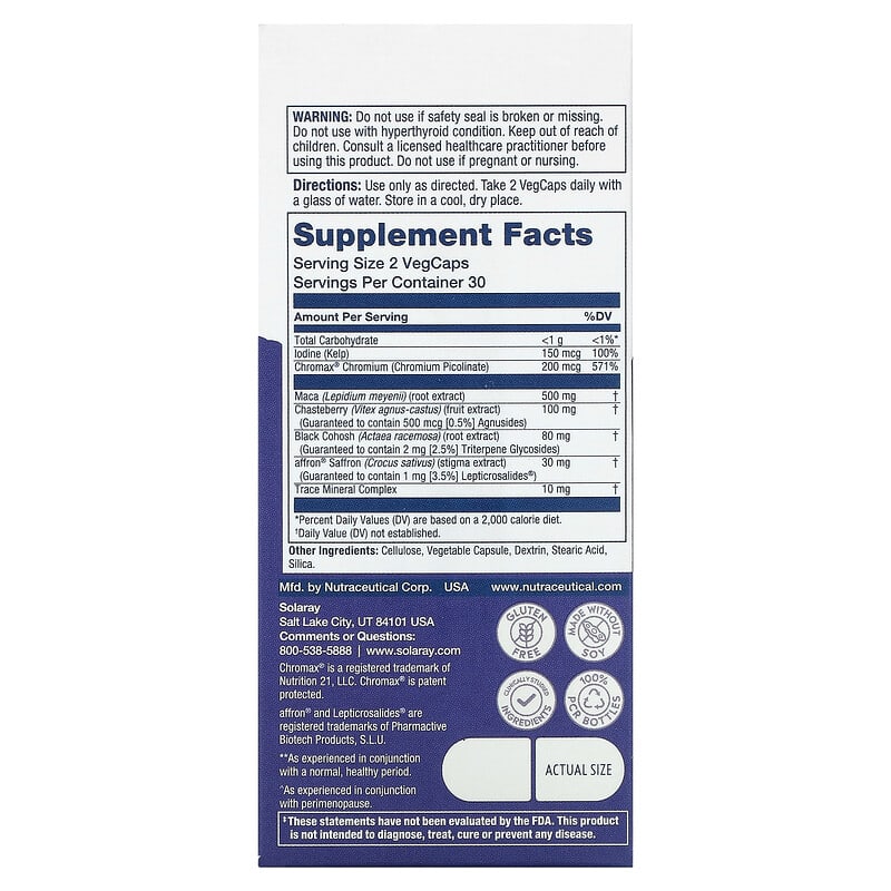 Sản phẩm Solaray Her Life Stages Perimenopause chứa nhiều thành phần tự nhiên đã được nghiên cứu lâm sàng, bao gồm: