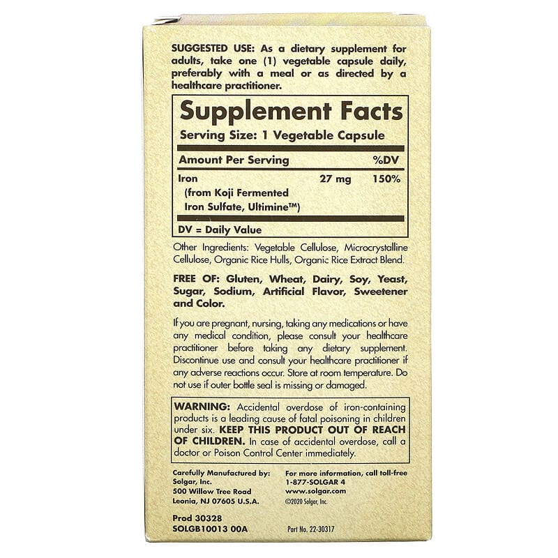 Viên sắt Fermented Koji Iron 27 mg từ Solgar, hỗ trợ sức khỏe, tăng cường năng lượng, 60 viên thực vật tự nhiên. 033984005358
