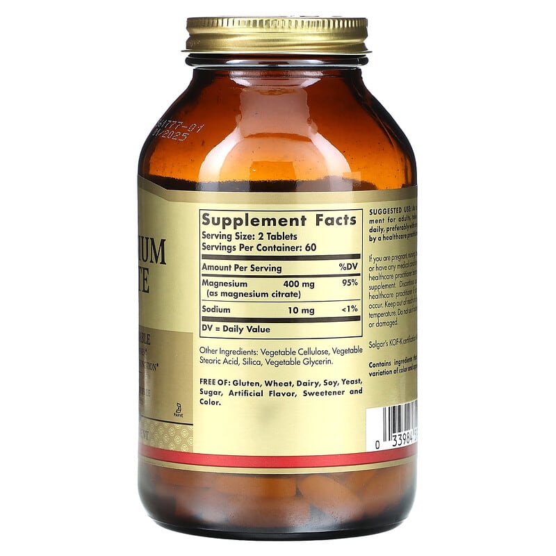 – Sodium: 10 mg (<1% giá trị hàng ngày)Ngoài ra, sản phẩm còn chứa các thành phần khác như cellulose thực vật, stearic acid thực vật, silica và glycerin thực vật. Sản phẩm hoàn toàn không chứa gluten, lúa mì, sữa, đậu nành, men, đường, hương liệu nhân tạo, chất tạo ngọt và phẩm màu.Hướng dẫn sử dụngĐể đạt được hiệu quả tốt nhất, người lớn nên sử dụng Solgar Magnesium Citrate 120 Tablets với liều lượng 2 viên mỗi ngày, tốt nhất là dùng cùng với bữa ăn hoặc theo chỉ dẫn của chuyên gia y tế.Lưu ý khi sử dụng- Trước khi bắt đầu sử dụng sản phẩm, đặc biệt là nếu bạn đang mang thai, cho con bú, đang điều trị bằng thuốc hoặc có bất kỳ tình trạng y tế nào, bạn nên tham khảo ý kiến của bác sĩ hoặc chuyên gia y tế.