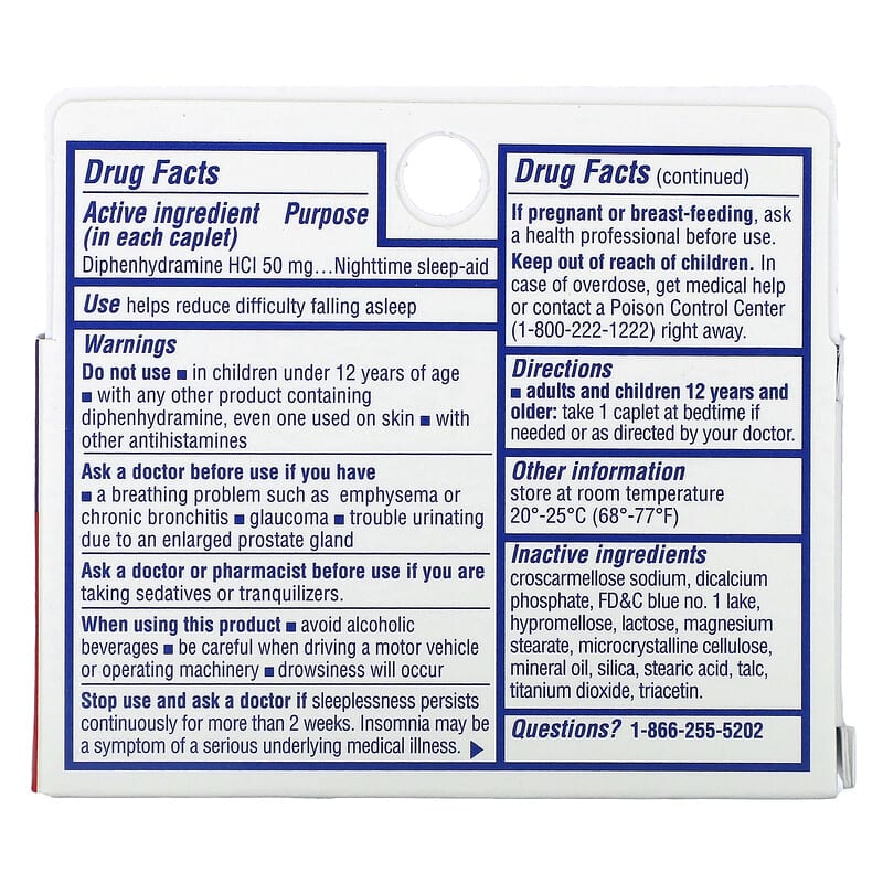 Sominex Nighttime Sleep-Aid chứa thành phần chính là Diphenhydramine HCl với hàm lượng 50 mg trong mỗi viên. Diphenhydramine HCl là một loại thuốc kháng histamine, được biết đến với khả năng gây buồn ngủ, giúp người dùng dễ dàng đi vào giấc ngủ. Ngoài ra, sản phẩm còn chứa các thành phần không hoạt động như Croscarmellose sodium, dicalcium phosphate, FD&C Blue No. 1 Lake, hypromellose, lactose, magnesium stearate, microcrystalline cellulose, mineral oil, silica, stearic acid, talc, titanium dioxide và triacetin. Những thành phần này giúp ổn định và tăng cường hiệu quả của sản phẩm.
