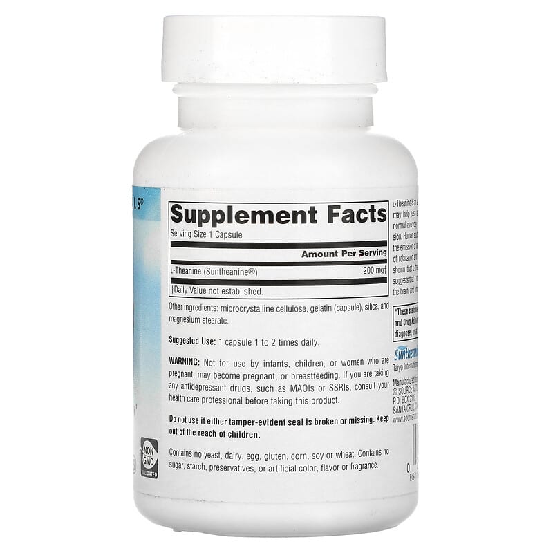 Mỗi viên nang Source Naturals Serene Science L-Theanine chứa 200 mg L-Theanine (Suntheanine®). Ngoài ra, sản phẩm còn có các thành phần khác như: