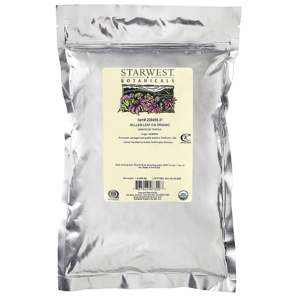 Lá Mullein Hữu Cơ Cắt Nhỏ Starwest Botanicals 1 lb hỗ trợ sức khỏe, tự nhiên và an toàn cho người dùng., UPC 767963073297