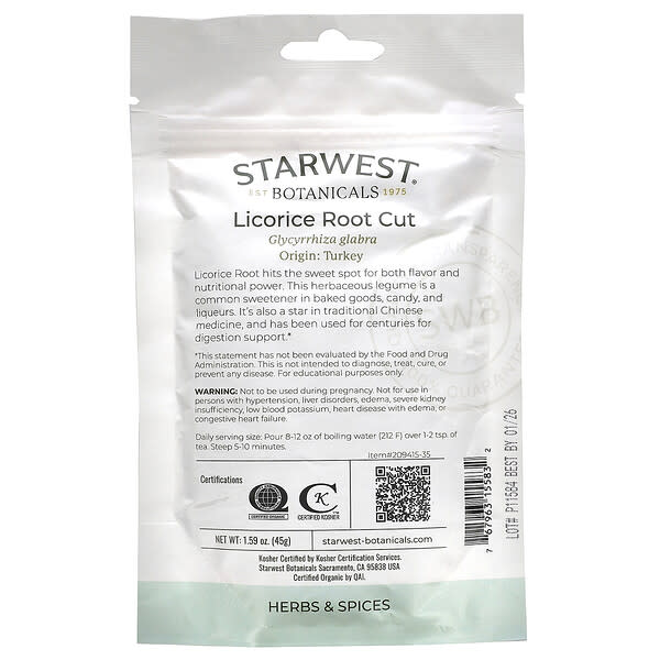 Thông tin sản phẩm Starwest Botanicals, Certified Organic Licorice Root Cut, 1,59 oz (45 g)