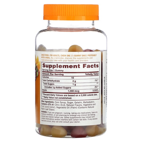 Biotin là một loại vitamin thuộc nhóm B, đóng vai trò quan trọng trong việc duy trì sức khỏe của tóc, da và móng. Với hàm lượng 1.000 mcg mỗi viên, Sundown Naturals, Biotin Gummies mang đến những công dụng nổi bật như: