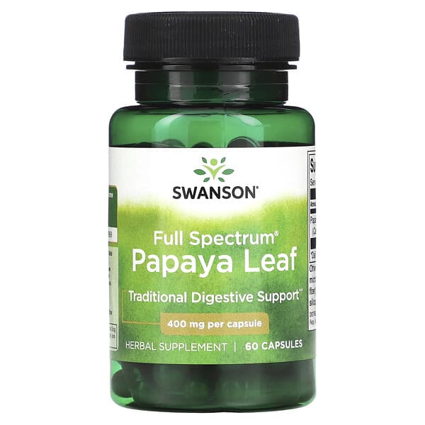 Viên uống Swanson, Full Spectrum Papaya Leaf chứa 400 mg lá đu đủ (Carica papaya) trong mỗi viên. Lá đu đủ đã được sử dụng từ lâu trong các nền văn hóa truyền thống như một phương thuốc tự nhiên để hỗ trợ tiêu hóa. Các enzyme tự nhiên có trong lá đu đủ giúp phân hủy protein và carbohydrate, từ đó hỗ trợ quá trình tiêu hóa diễn ra dễ dàng hơn.