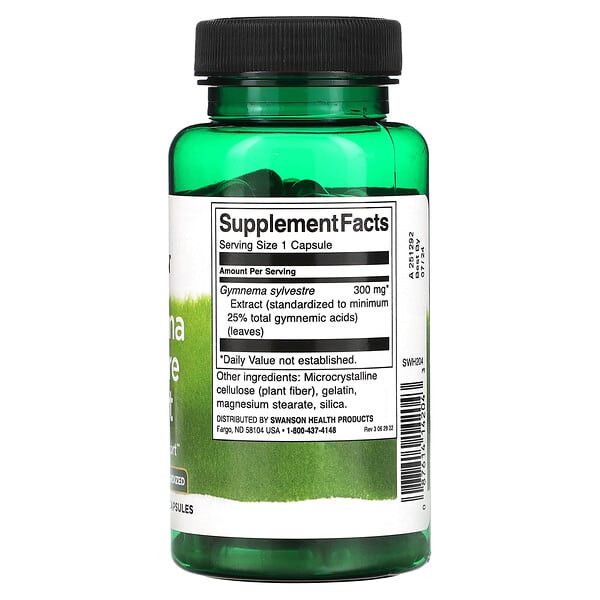 Mỗi viên nang Swanson Gymnema Sylvestre Extract cung cấp 300 mg chiết xuất Gymnema sylvestre, được chuẩn hóa tối thiểu 25% tổng gymnemic acids. Các thành phần khác bao gồm: