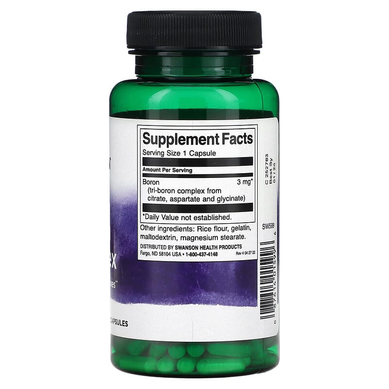 Mỗi viên nang Swanson Triple Boron Complex chứa 3 mg boron dưới dạng tri-boron complex từ ba nguồn chính: boron citrate, boron aspartate và boron glycinate. Sự kết hợp này không chỉ giúp tối ưu hóa khả năng hấp thụ mà còn đảm bảo rằng cơ thể có thể sử dụng boron một cách hiệu quả nhất.