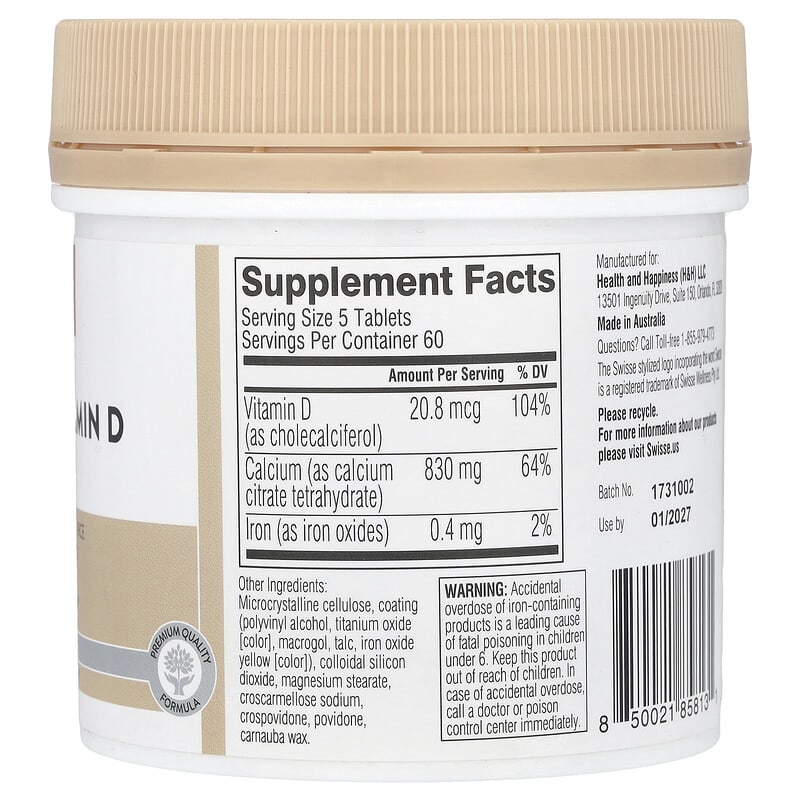– Vitamin D: Mỗi liều dùng cũng cung cấp 20.8 mcg vitamin D (dưới dạng cholecalciferol), tương đương 104% nhu cầu hàng ngày. Vitamin D đóng vai trò quan trọng trong việc hỗ trợ hấp thụ canxi, giúp canxi được vận chuyển và tích lũy vào xương một cách hiệu quả.