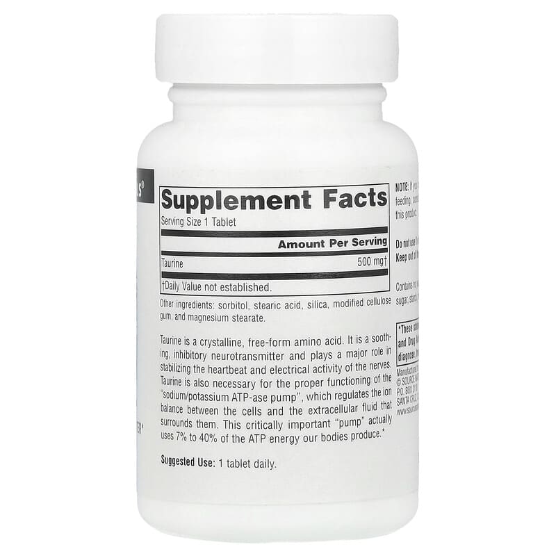 Taurine Source Naturals 500 mg hỗ trợ sức khỏe tim mạch, tăng cường năng lượng và cải thiện tâm trạng, 60 viên tiện lợi., UPC 021078012801
