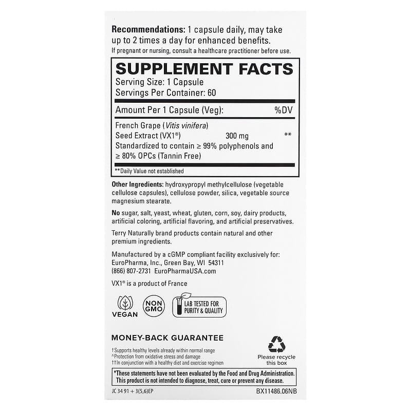 Terry Naturally Clinical OPC chứa chiết xuất từ hạt nho Pháp VX1® với hàm lượng polyphenol lên đến 99%, giúp mang lại nhiều lợi ích sức khỏe: