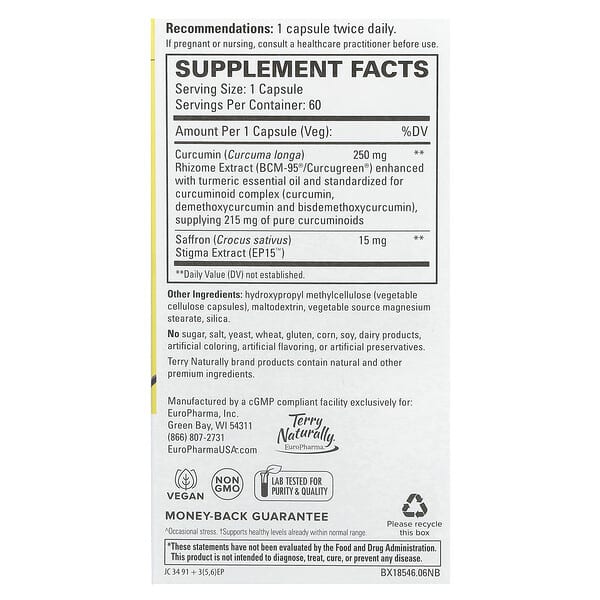 Saffron Life + Curcumin Terry Naturally, sản phẩm chính hãng từ Mỹ, hỗ trợ sức khỏe, giảm căng thẳng, tăng cường miễn dịch., UPC: 367703185466