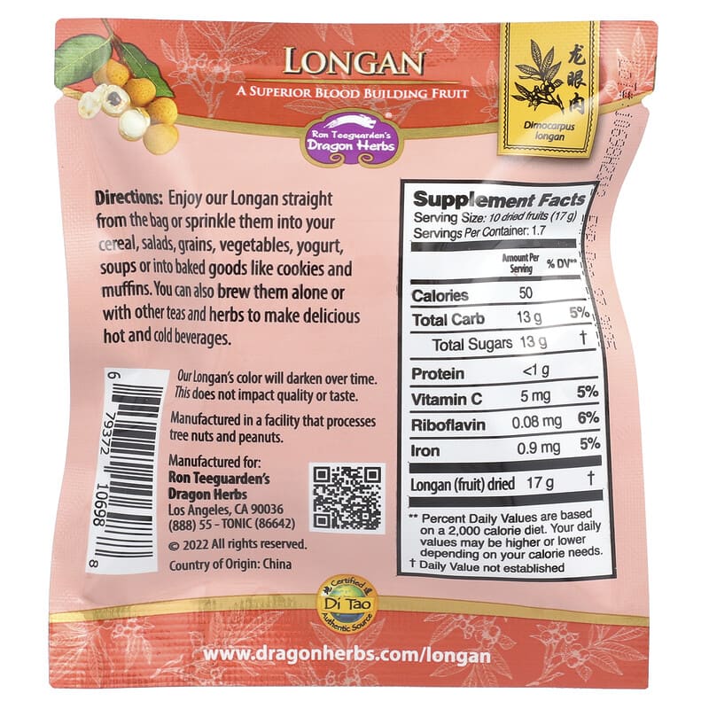 Sản phẩm Dragon Herbs Longan 1 oz (28 g) chứa thành phần chính là quả longan (Dimocarpus Longan), một loại trái cây được biết đến với nhiều tác dụng hữu ích cho sức khỏe. Mỗi khẩu phần 10 trái longan khô (17 g) cung cấp khoảng 50 calo, 13 g carbohydrate, 13 g đường tự nhiên, và các vitamin như Vitamin C (5 mg), Riboflavin (0.08 mg), và sắt (0.9 mg).